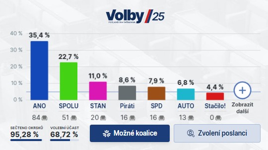 По результатам обработки более 95% голосов, популистская партия ANO экс-премьера Андрея Бабиша имеет 35,4% голосов, что обеспечивает им 84 мандата в Палате депутатов из 200.