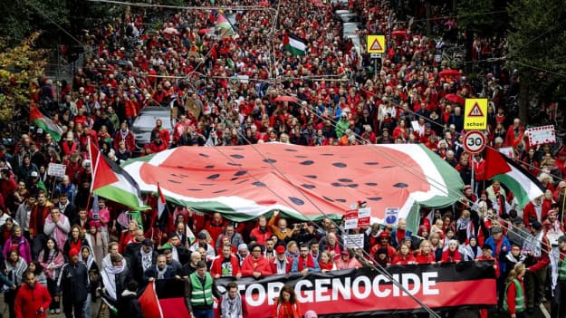 "Мы должны уважать наши международные соглашения", – сказал мужчина с плакатом с заявлением ООН. "Все страны должны сделать все возможное, чтобы остановить геноцид в Газе", – говорилось в нем. "Нидерланды являются крупным инвестором в Израиль; мы можем послать сигнал, который действительно имеет значение. И правительство должно это сделать", – сказал он.