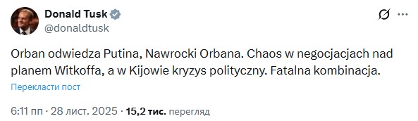 "Орбан едет к Путину, Навроцкий к Орбану. В переговорах по "плану Уиткоффа" хаос, а в Киеве политический кризис. Фатальная комбинация", – написал он.